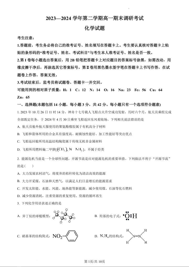 河北省保定市2023-2024学年高一下学期期末调研考试化学(原卷版)