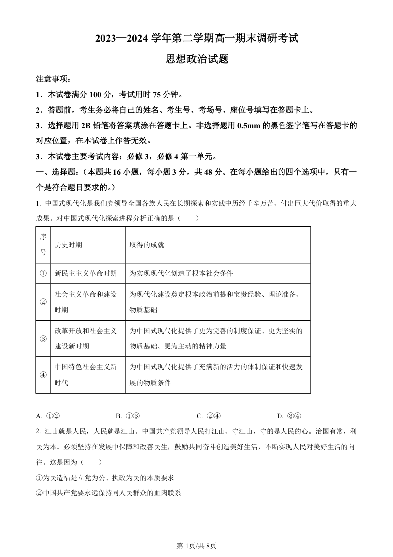 河北省保定市2023-2024学年高一下学期期末调研考试政治(原卷版)