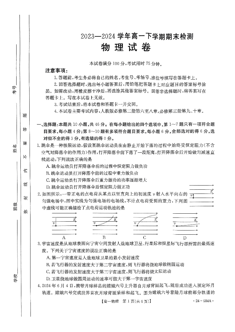河南省部分学校2023-2024学年高一下学期7月期末考试物理