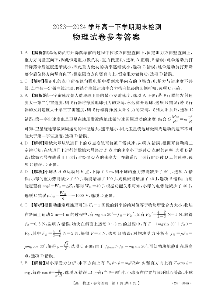 河南省部分学校2023-2024学年高一下学期7月期末考试物理答案