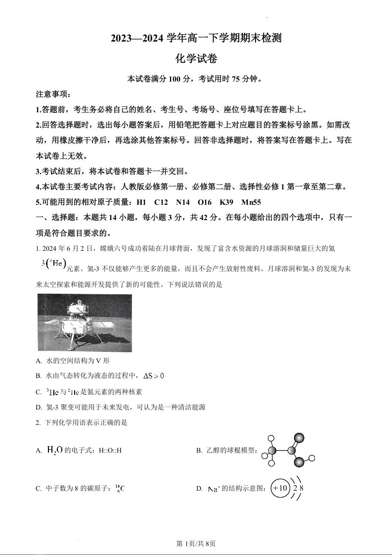河南省部分学校2023-2024学年高一下学期7月期末考试化学(原卷版)