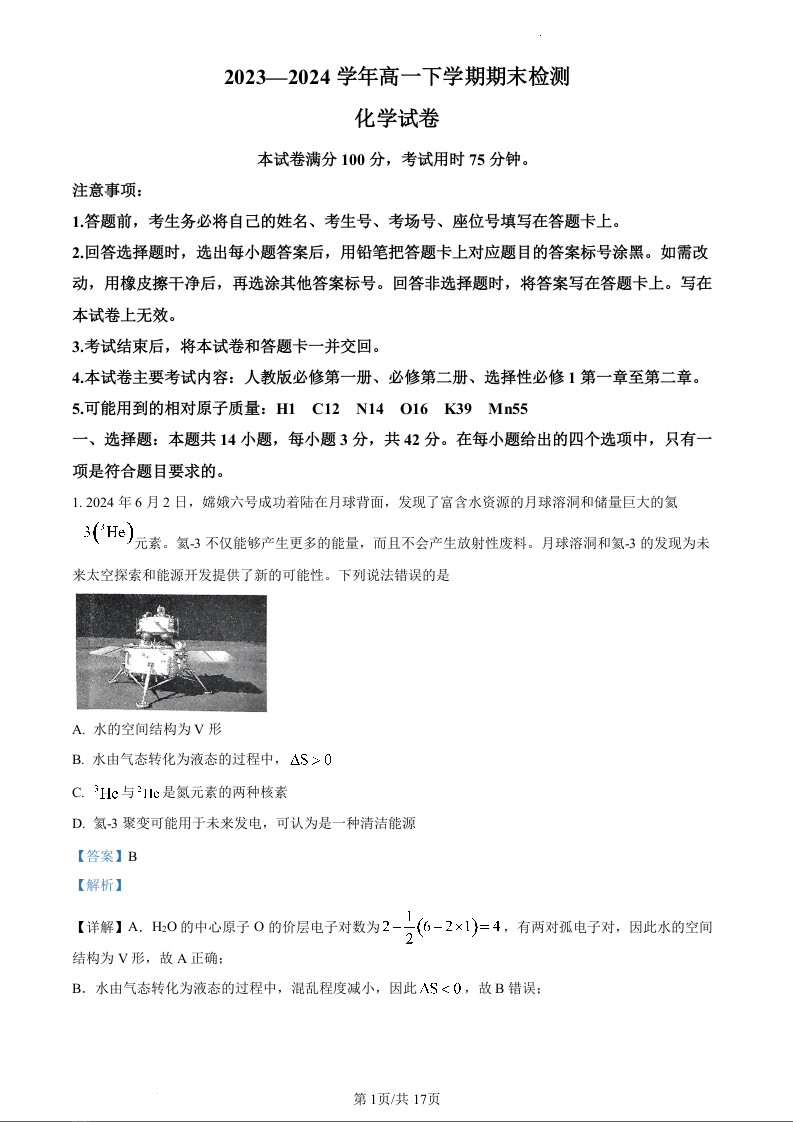 河南省部分学校2023-2024学年高一下学期7月期末考试化学(精品解析版)