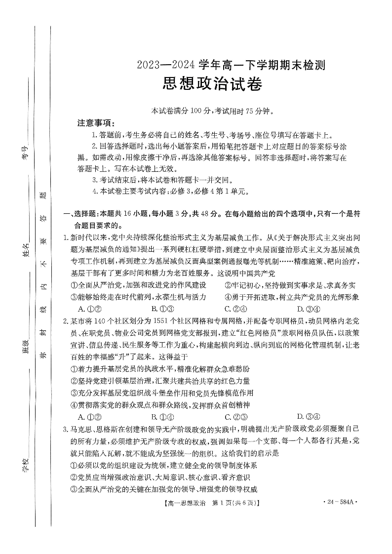 河南省部分学校2023-2024学年高一下学期7月期末考试政治