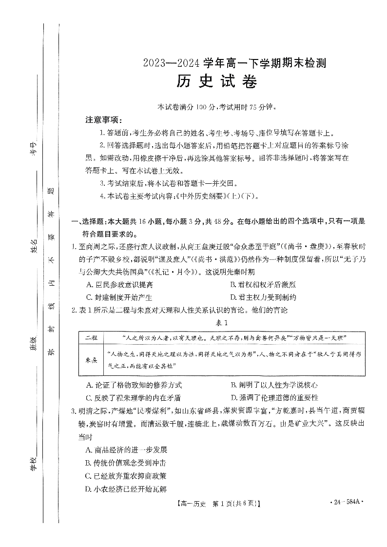 河南省部分学校2023-2024学年高一下学期7月期末考试历史