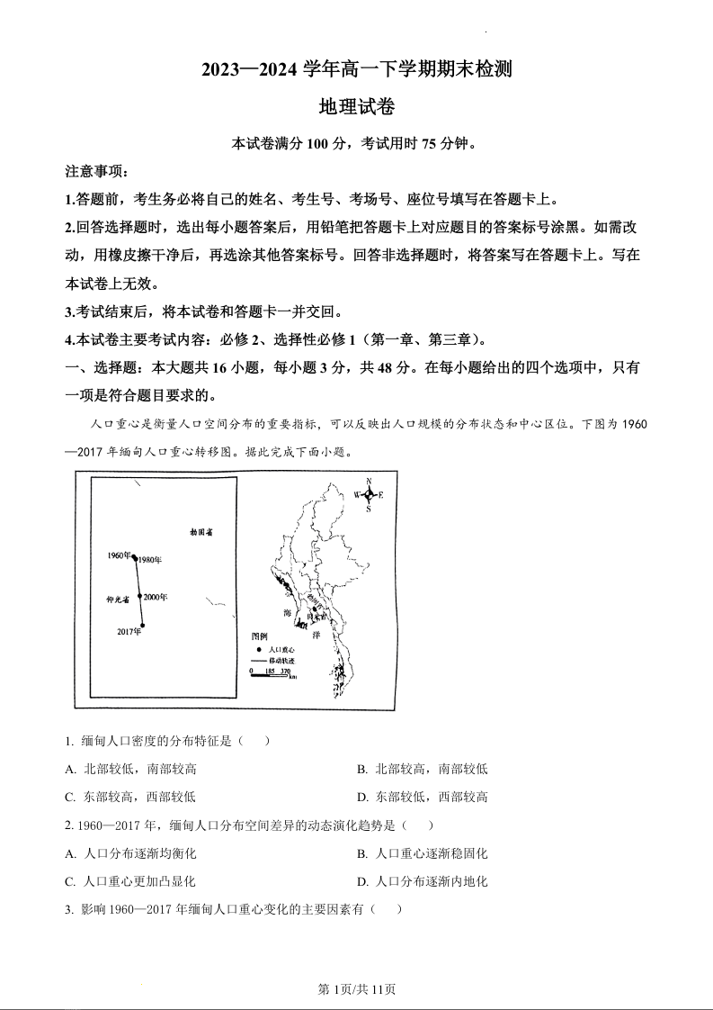 河南省部分学校2023-2024学年高一下学期7月期末考试地理(精品解析版)