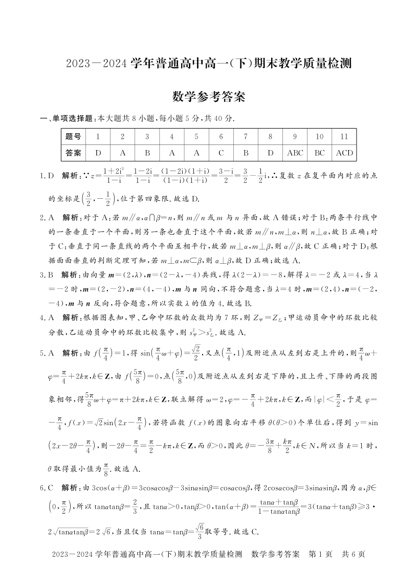 河南省信阳市2023-2024学年高一下学期7月期末考试数学答案