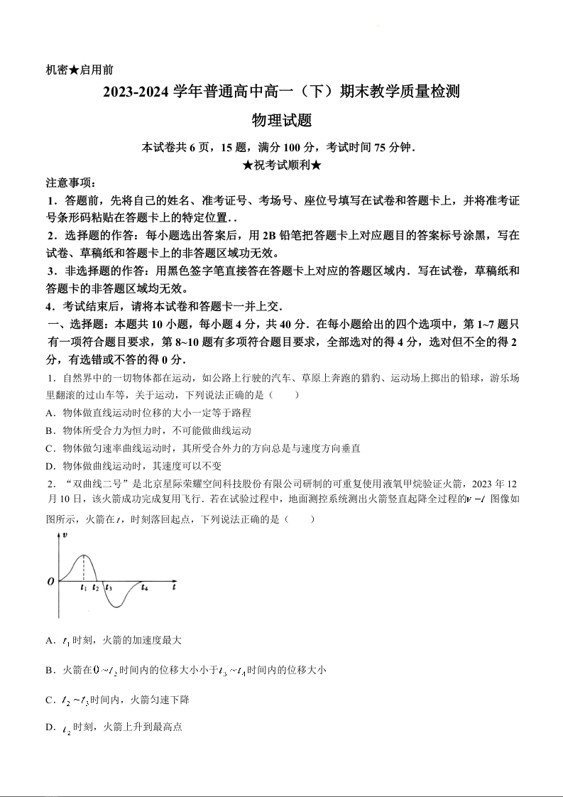 河南省信阳市2023-2024学年高一下学期7月期末考试物理