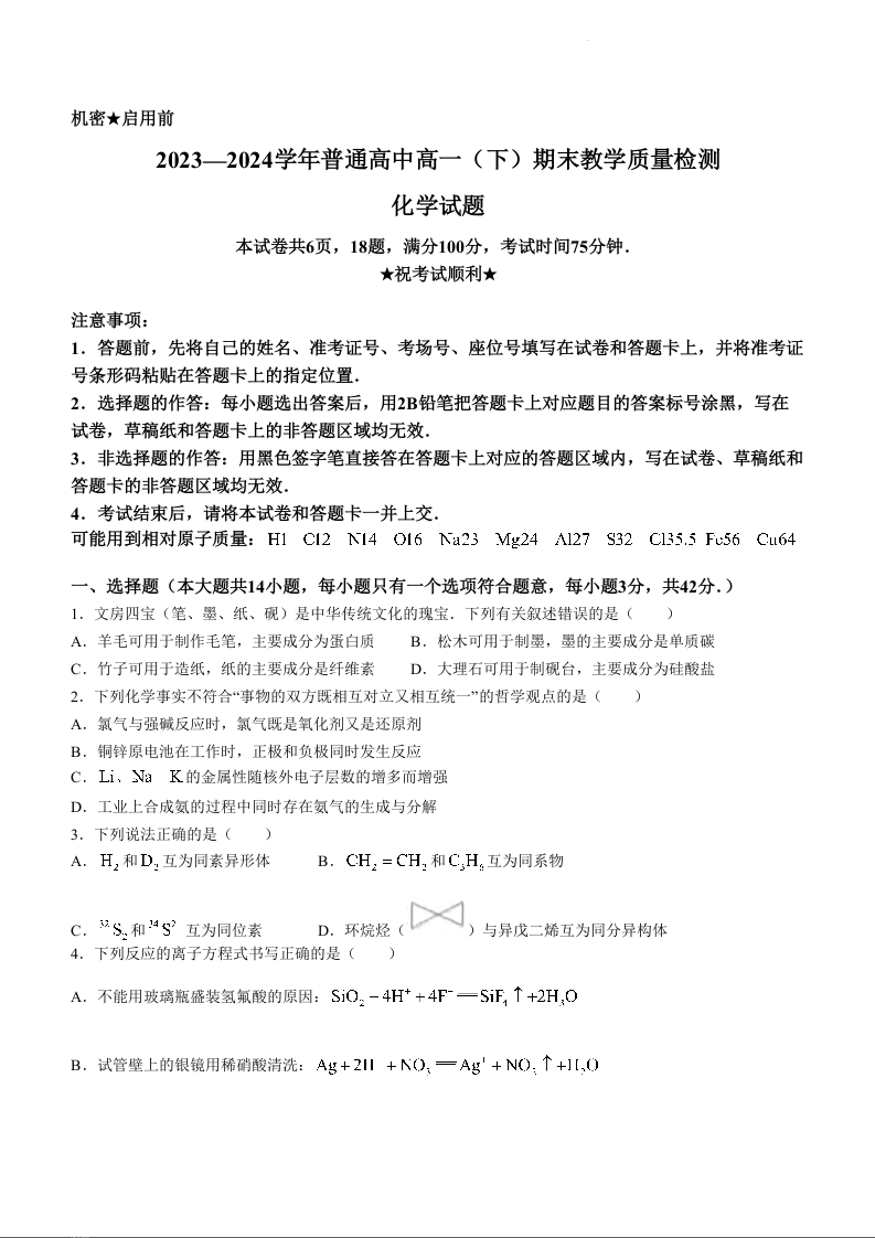 河南省信阳市2023-2024学年高一下学期7月期末考试化学