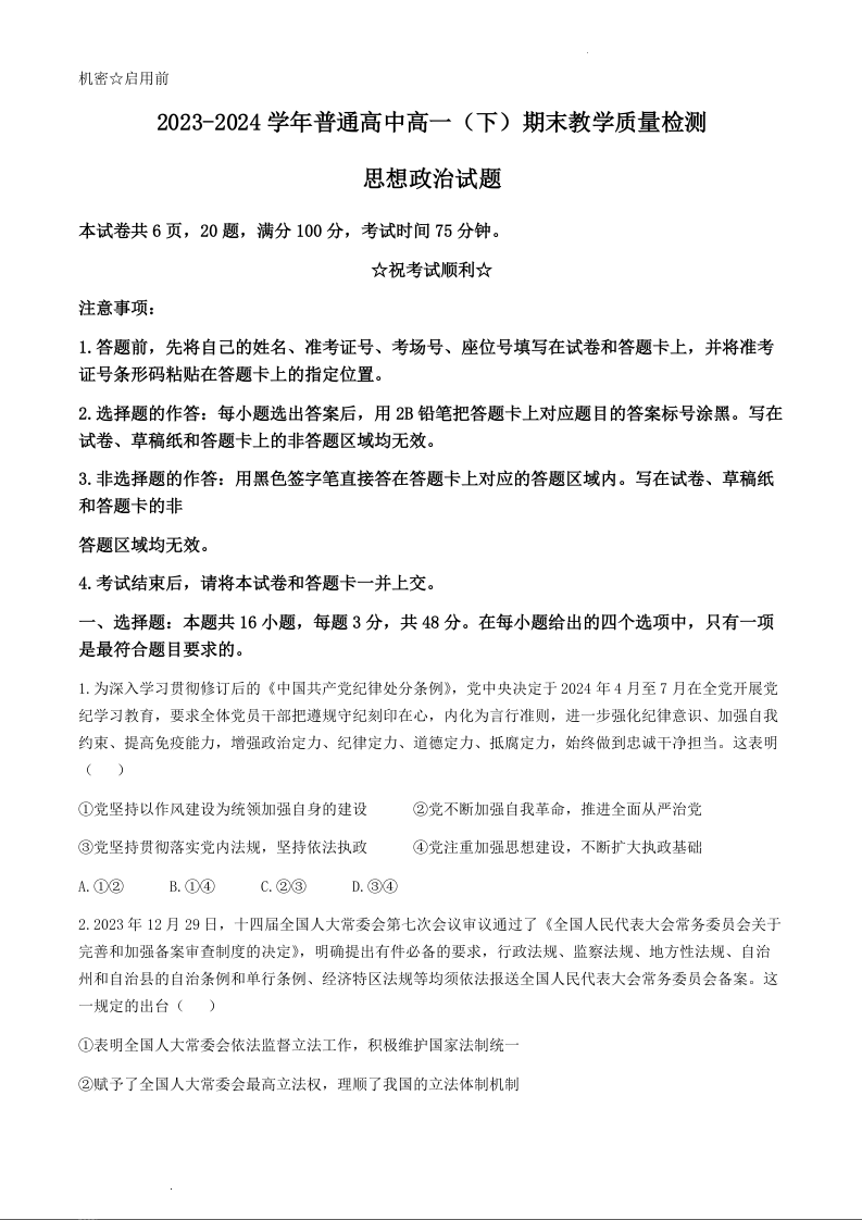 河南省信阳市2023-2024学年高一下学期7月期末考试政治