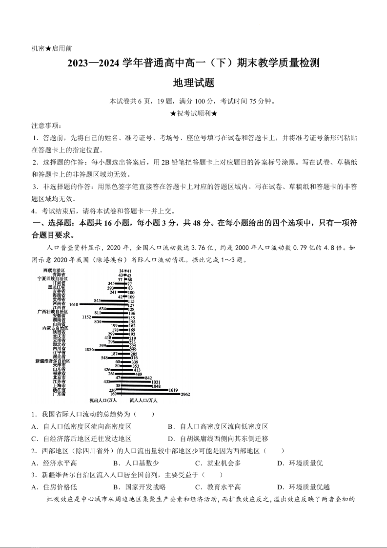 河南省信阳市2023-2024学年高一下学期7月期末考试地理+答案