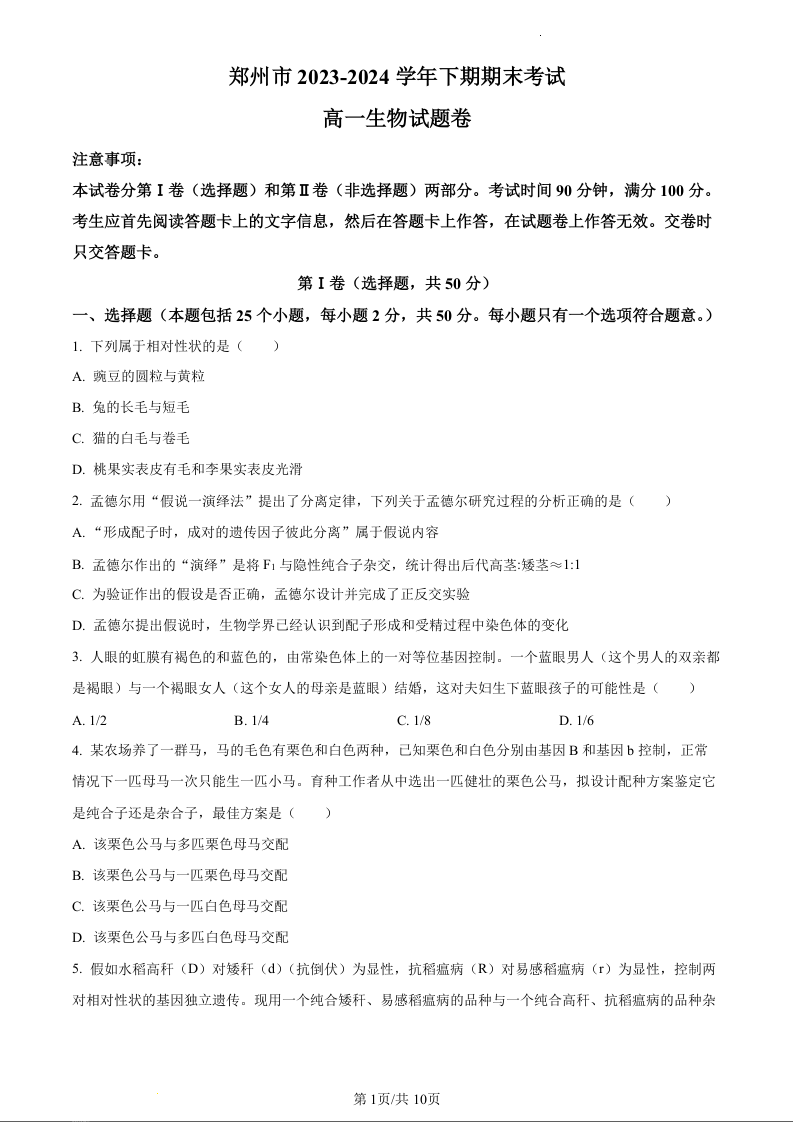 河南省郑州市2023-2024学年高一下学期期末考试生物(原卷版)
