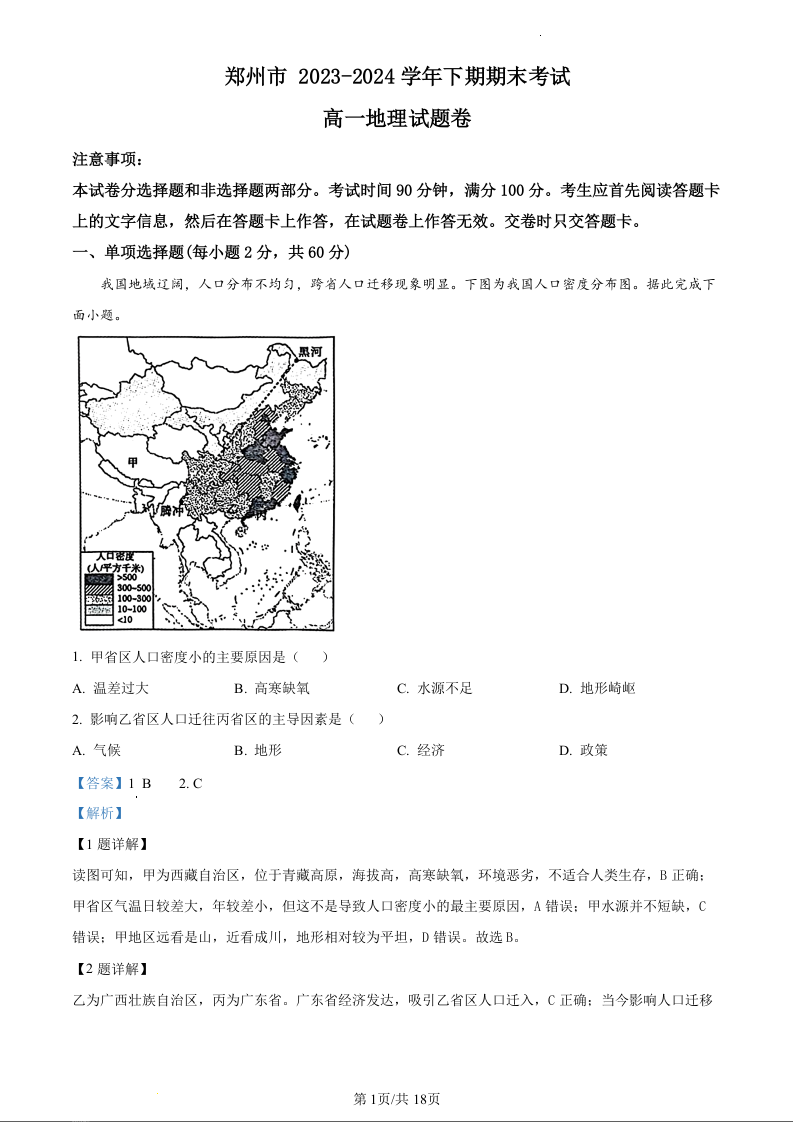 河南省郑州市2023-2024学年高一下学期期末考试地理(精品解析版)