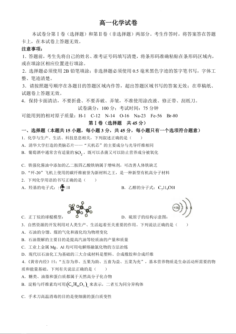 黑龙江省齐齐哈尔市2023-2024学年高一下学期7月期末考试化学+答案