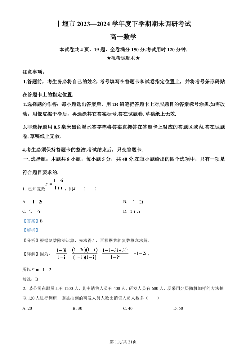 湖北省十堰市2023-2024学年高一下学期6月期末调研考试数学(精品解析版)