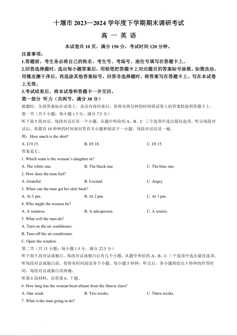 湖北省十堰市2023-2024学年高一下学期6月期末调研考试英语+答案