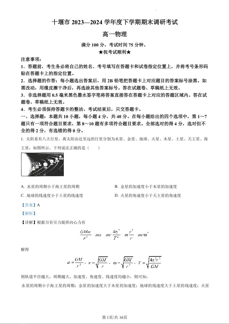 湖北省十堰市2023-2024学年高一下学期6月期末调研考试物理(精品解析版)