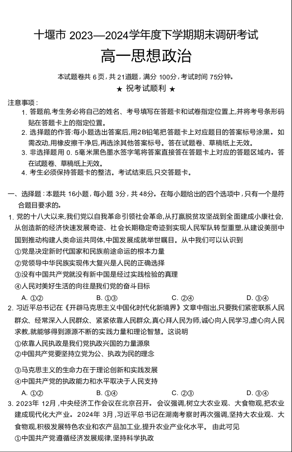 湖北省十堰市2023-2024学年高一下学期6月期末调研考试政治
