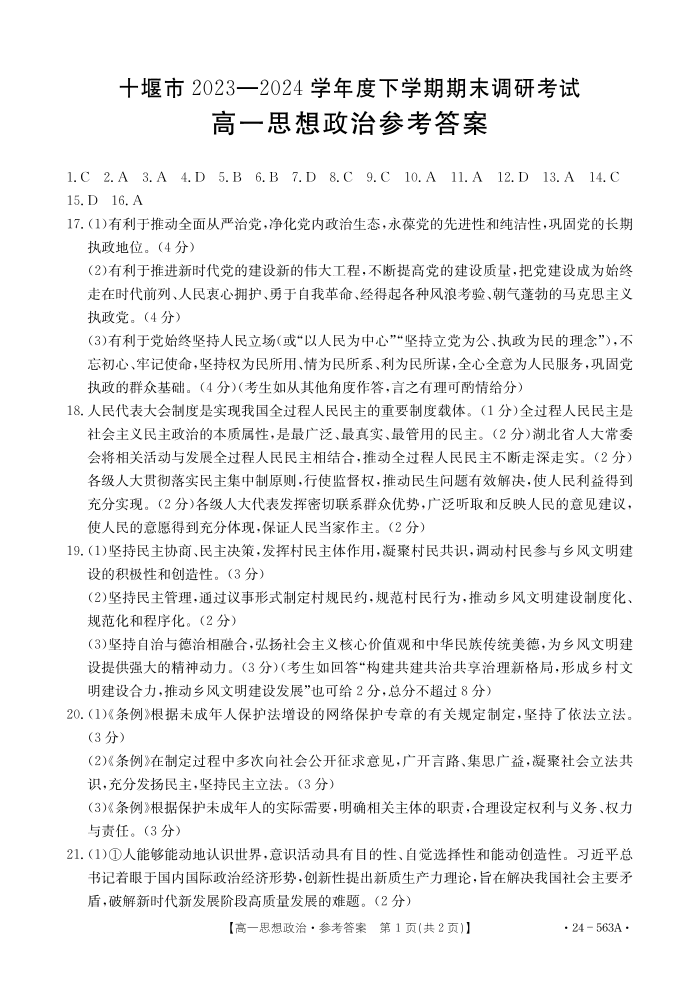湖北省十堰市2023-2024学年高一下学期6月期末调研考试政治答案