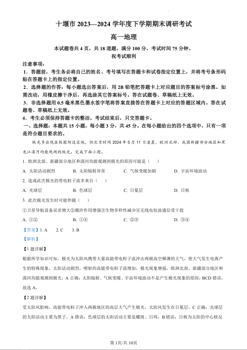 湖北省十堰市2023-2024学年高一下学期6月期末调研考试地理(精品解析版)