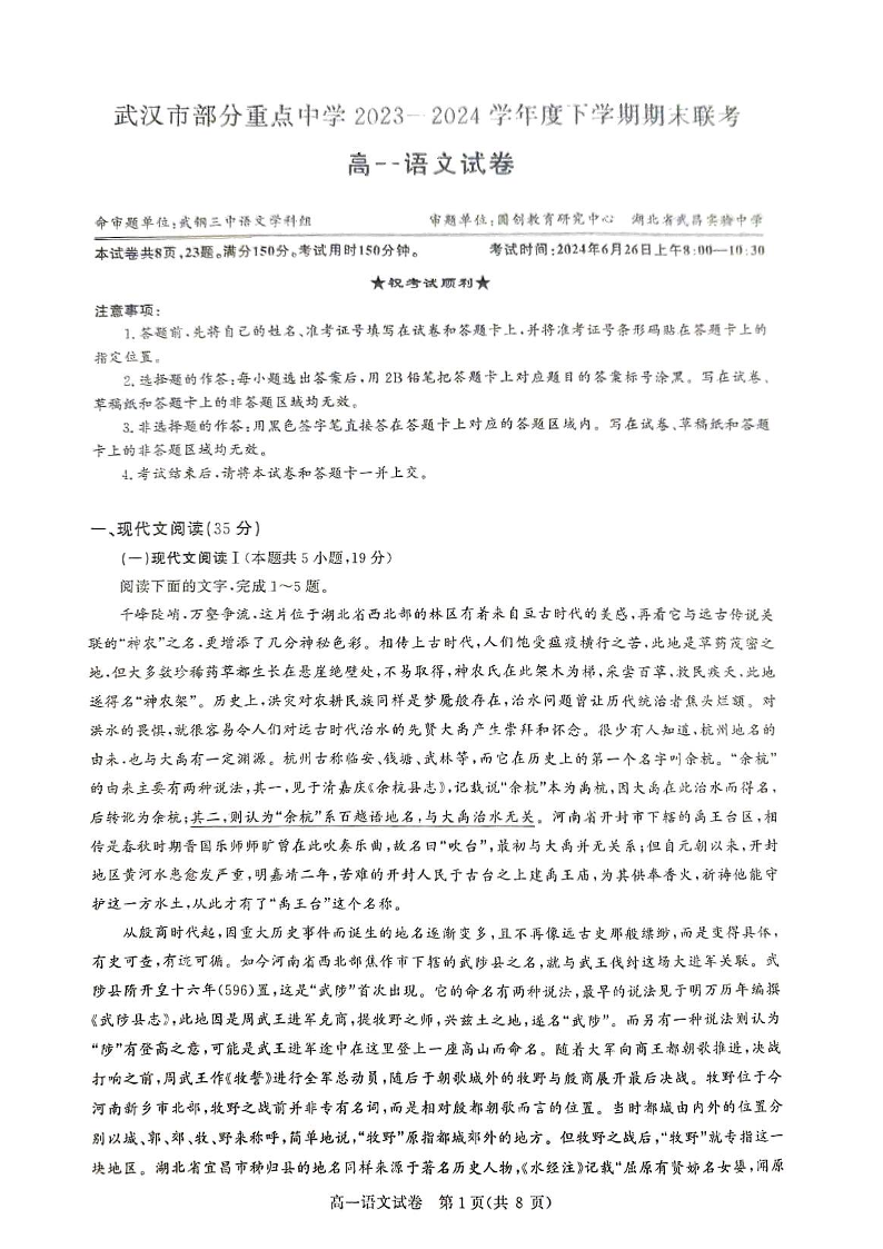 湖北省武汉市部分重点中学联考2023-2024学年高一下学期6月期末考试语文
