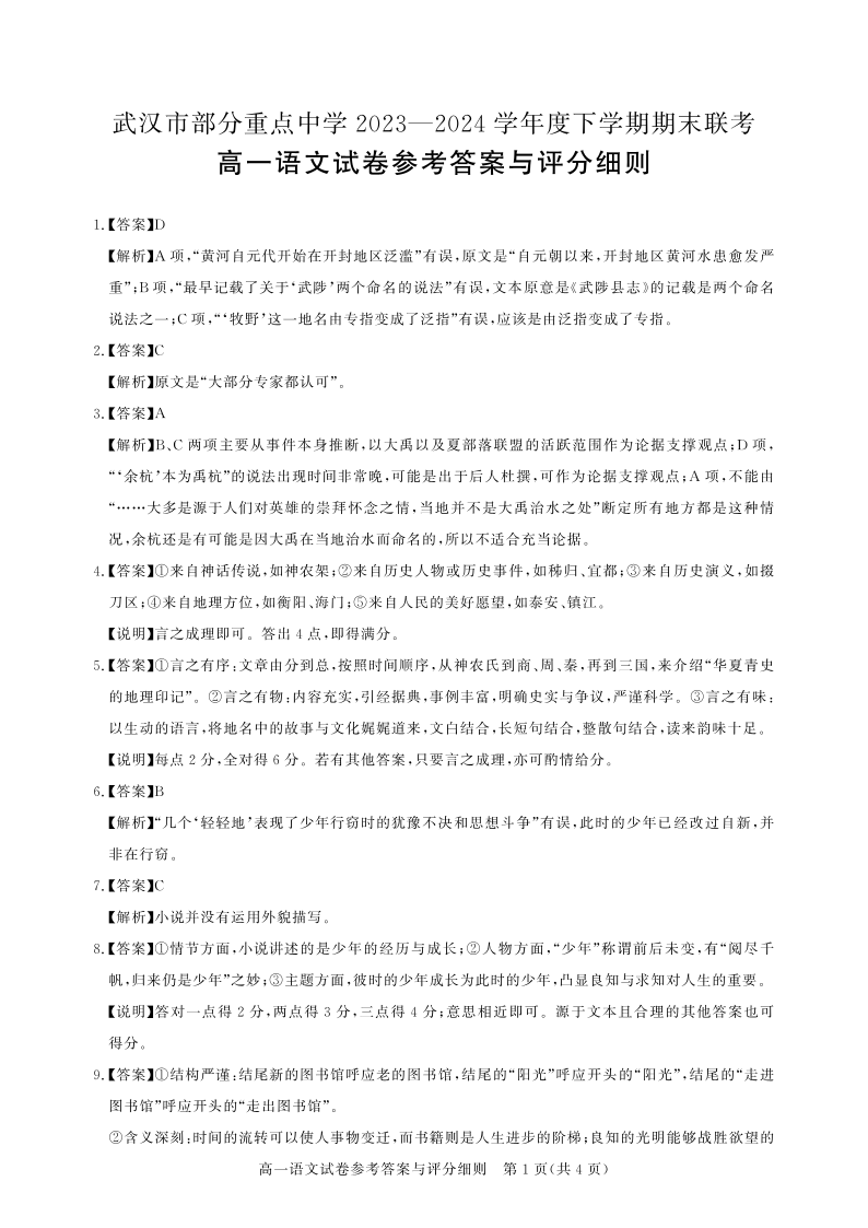 湖北省武汉市部分重点中学联考2023-2024学年高一下学期6月期末考试语文答案