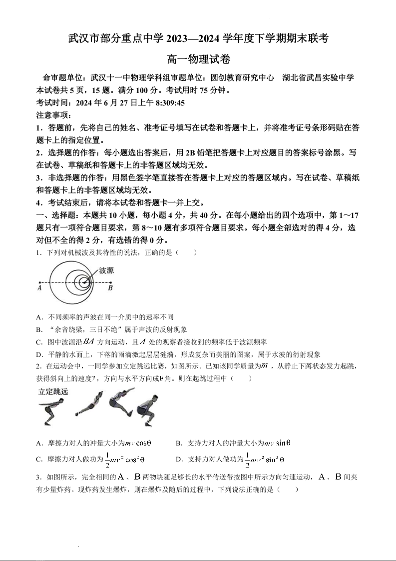 湖北省武汉市部分重点中学联考2023-2024学年高一下学期6月期末考试物理+答案