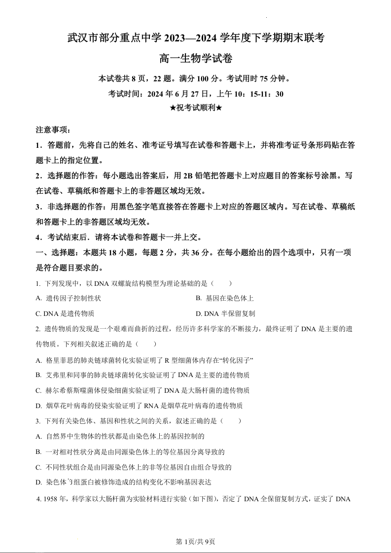 湖北省武汉市部分重点中学联考2023-2024学年高一下学期6月期末考试生物(原卷版)