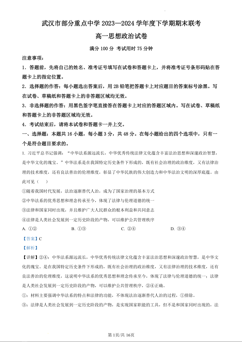 湖北省武汉市部分重点中学联考2023-2024学年高一下学期6月期末考试政治(精品解析版)