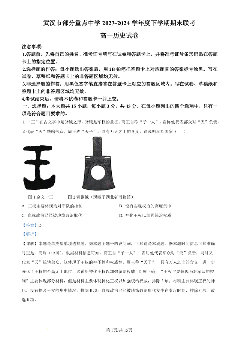 湖北省武汉市部分重点中学联考2023-2024学年高一下学期6月期末考试历史(精品解析版)