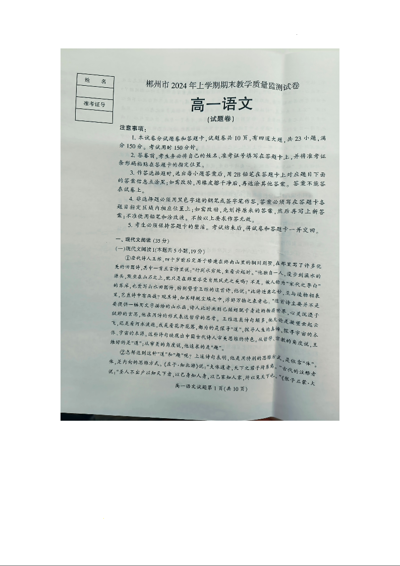 湖南省郴州市北湖区等5地2023-2024学年高一下学期7月期末考试语文