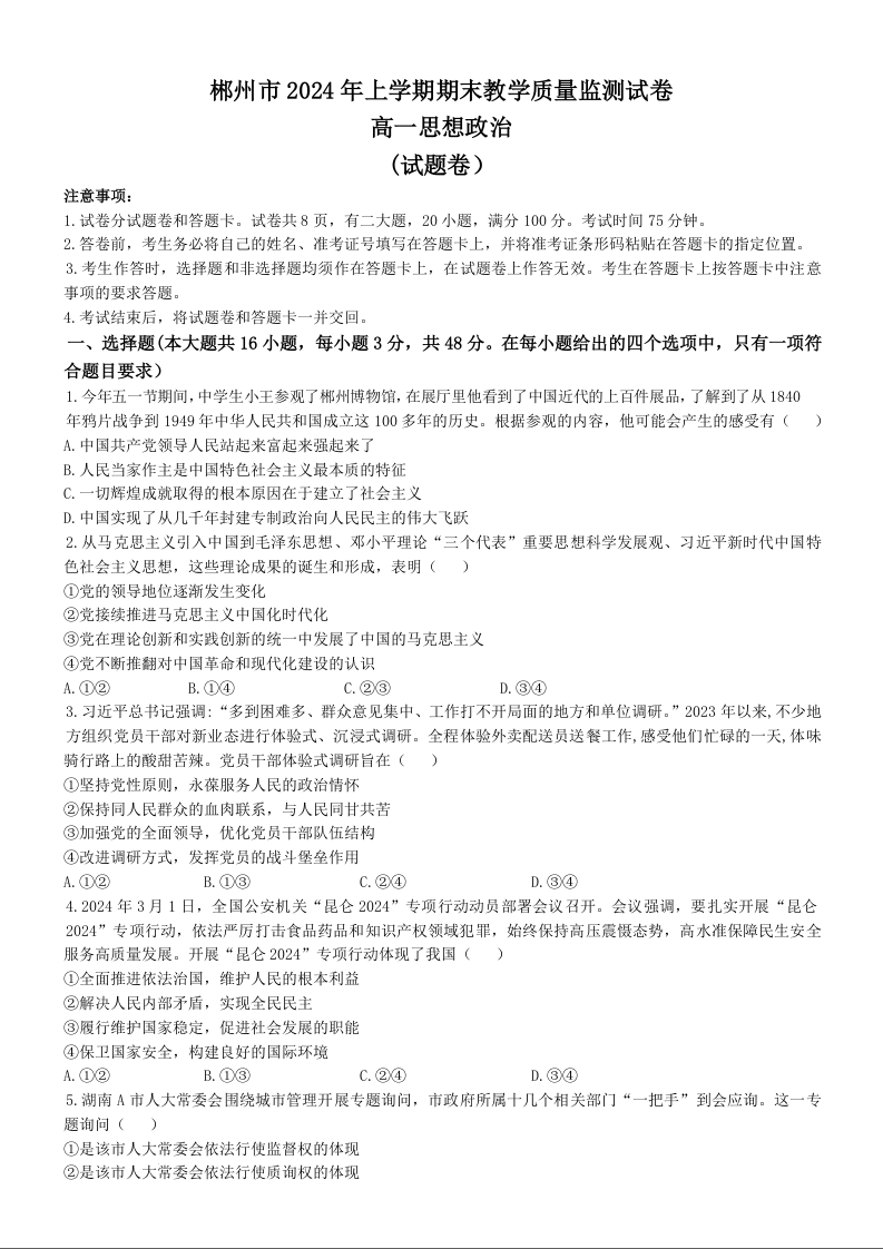 湖南省郴州市北湖区等5地2023-2024学年高一下学期7月期末考试政治