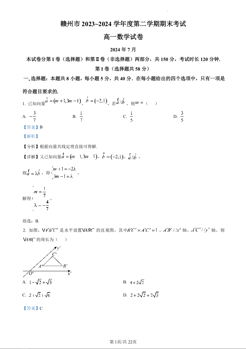 江西省赣州市2023-2024学年高一下学期期末考试数学(精品解析版)