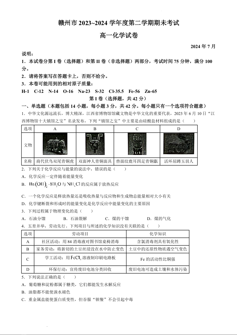 江西省赣州市2023-2024学年高一下学期期末考试化学
