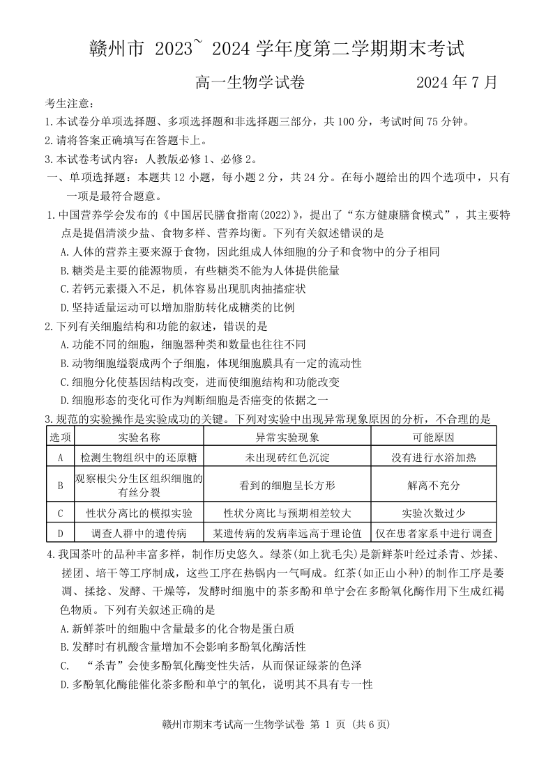 江西省赣州市2023-2024学年高一下学期期末考试生物