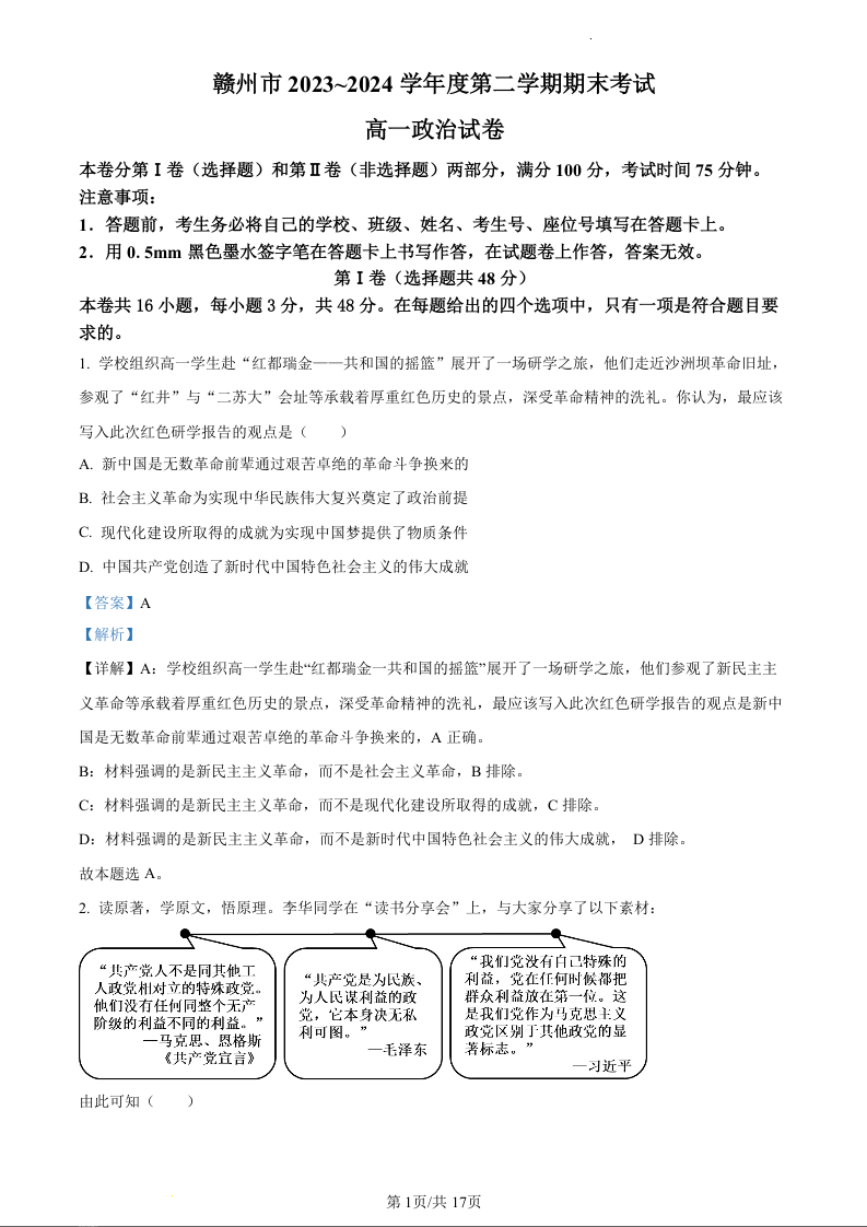 江西省赣州市2023-2024学年高一下学期期末考试政治(精品解析版)