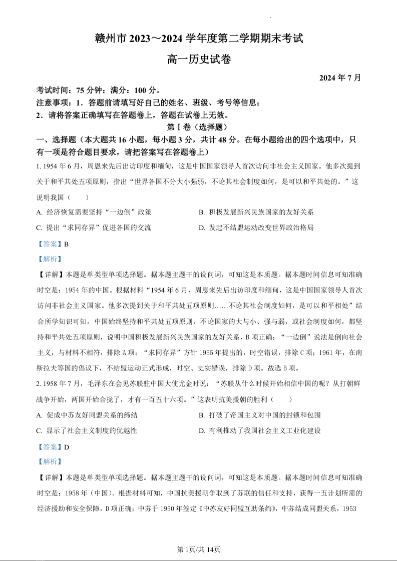 江西省赣州市2023-2024学年高一下学期期末考试历史(精品解析版)