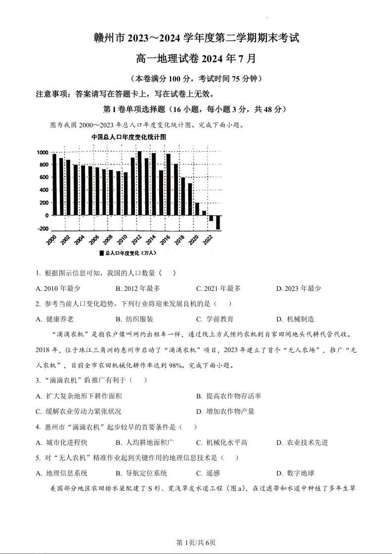 江西省赣州市2023-2024学年高一下学期期末考试地理(原卷版)