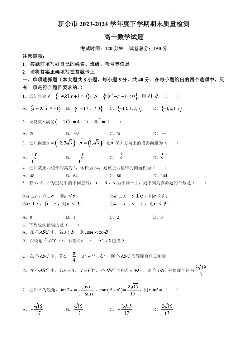 江西省新余市2023-2024学年高一下学期期末考试数学