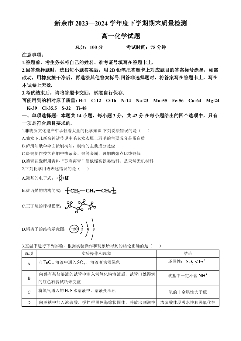 江西省新余市2023-2024学年高一下学期期末考试化学