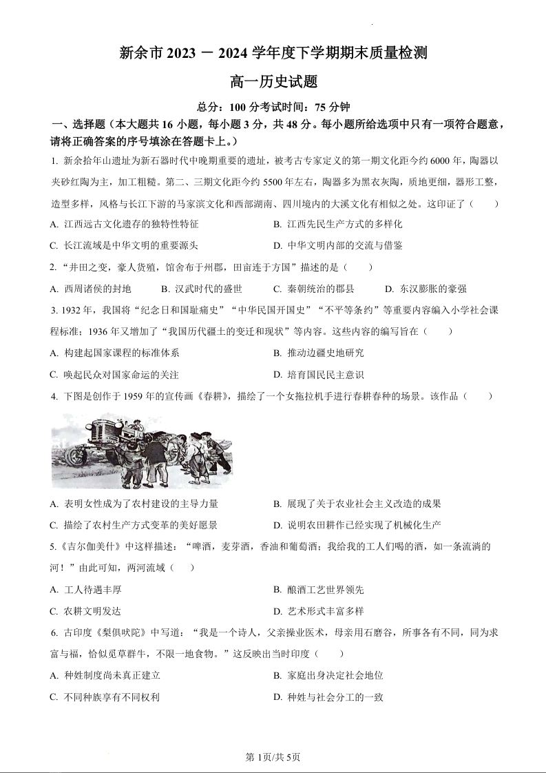 江西省新余市2023-2024学年高一下学期期末考试历史(原卷版)