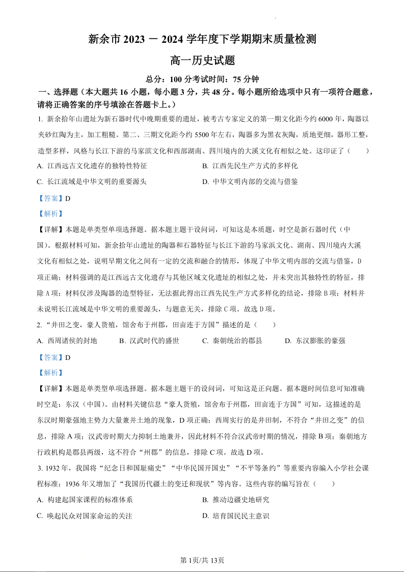江西省新余市2023-2024学年高一下学期期末考试历史(精品解析版)