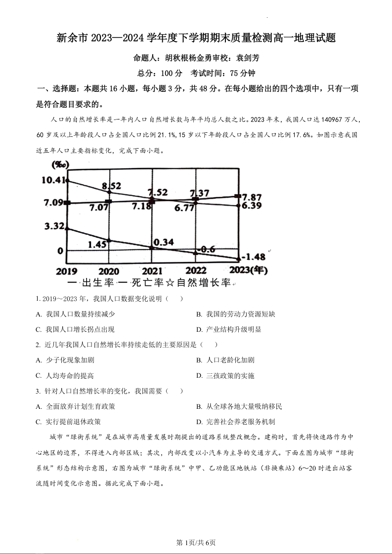 江西省新余市2023-2024学年高一下学期期末考试地理(原卷版)