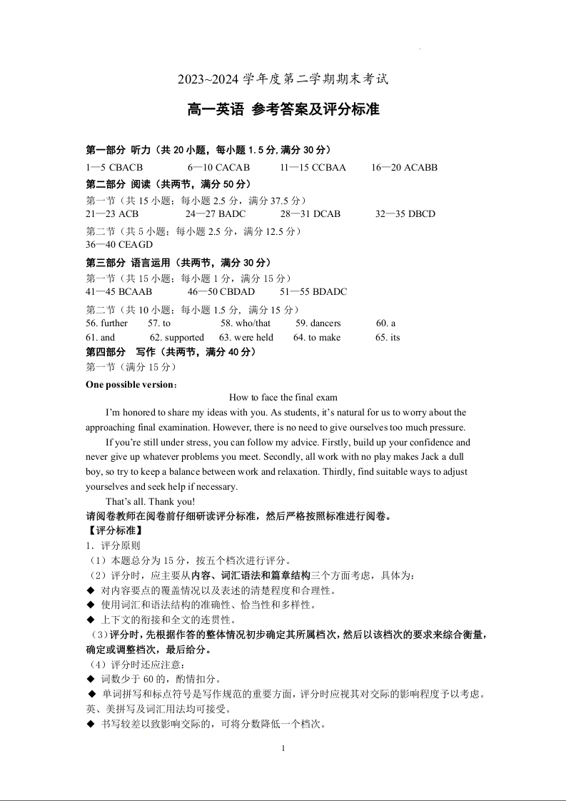 辽宁省锦州市2023-2024学年高一下学期期末考试英语答案