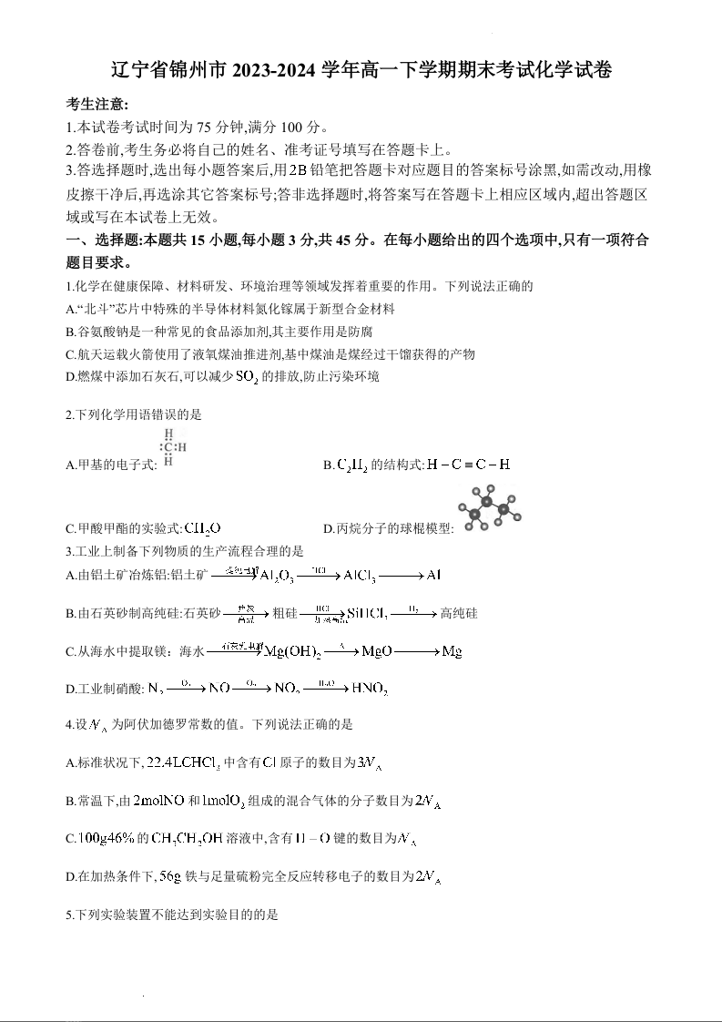 辽宁省锦州市2023-2024学年高一下学期期末考试化学+答案
