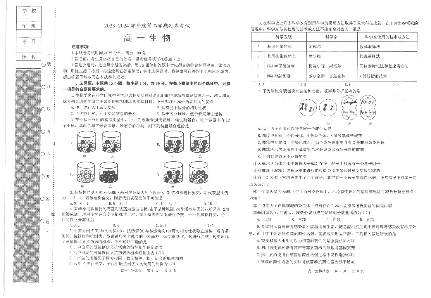 辽宁省锦州市2023-2024学年高一下学期期末考试生物