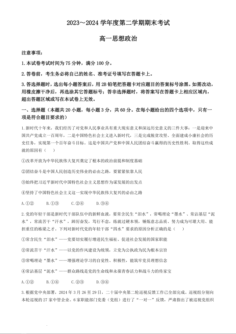 辽宁省锦州市2023-2024学年高一下学期期末考试政治+答案