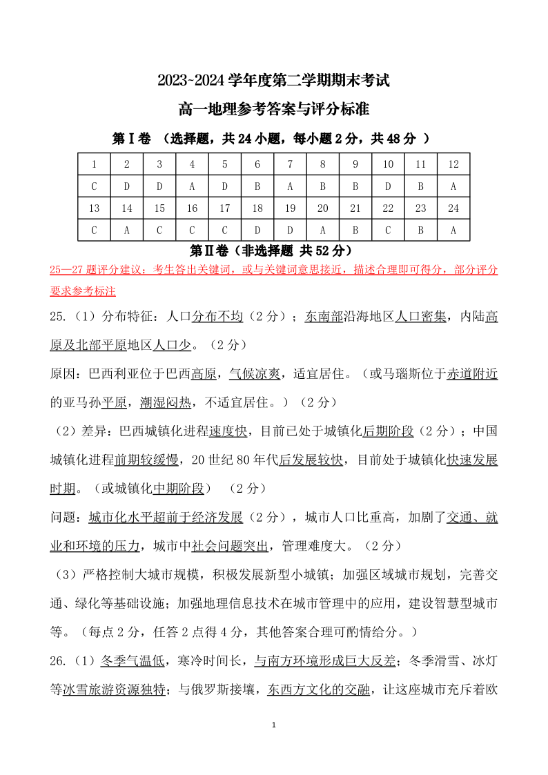 辽宁省锦州市2023-2024学年高一下学期期末考试地理答案
