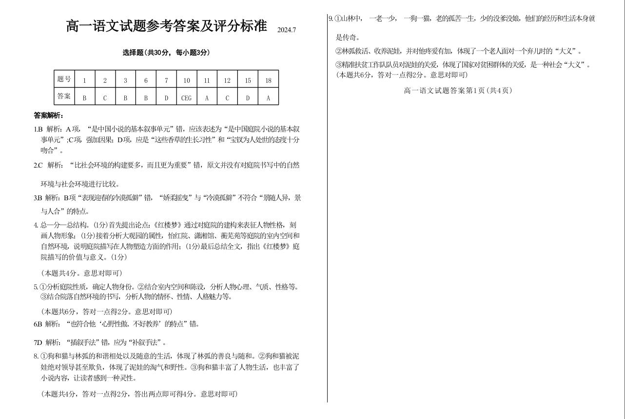 山东省滨州市2023-2024学年下学期高一年级期末考试语文答案