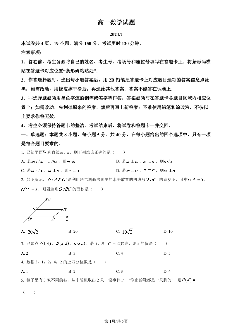 山东省滨州市2023-2024学年下学期高一年级期末考试数学(原卷版)