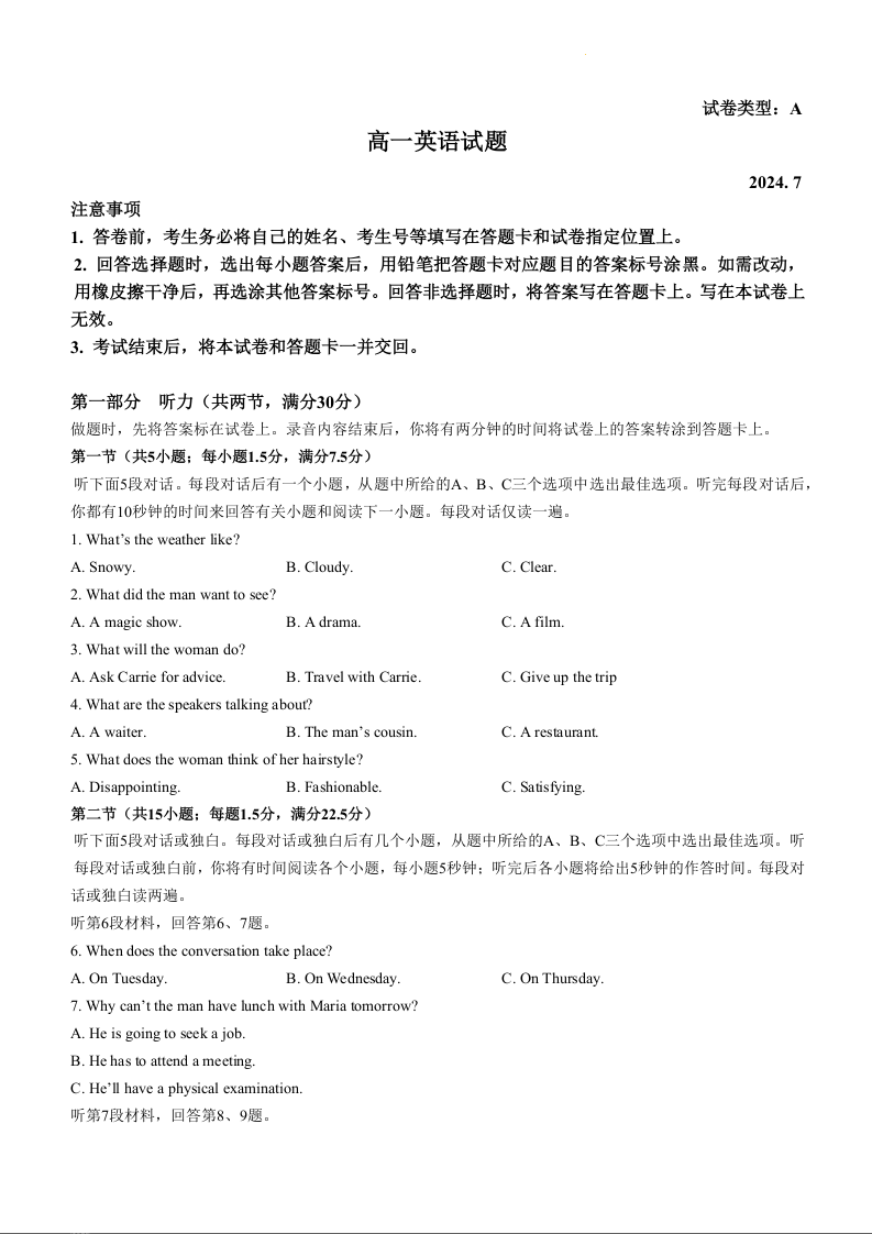 山东省滨州市2023-2024学年下学期高一年级期末考试英语+答案